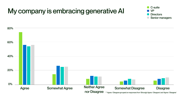 Upwork ran a survey last year on companies embracing Gen AI. 73% of c-suite exec believe their company are embracing it. Only 53% of senior managers agree.